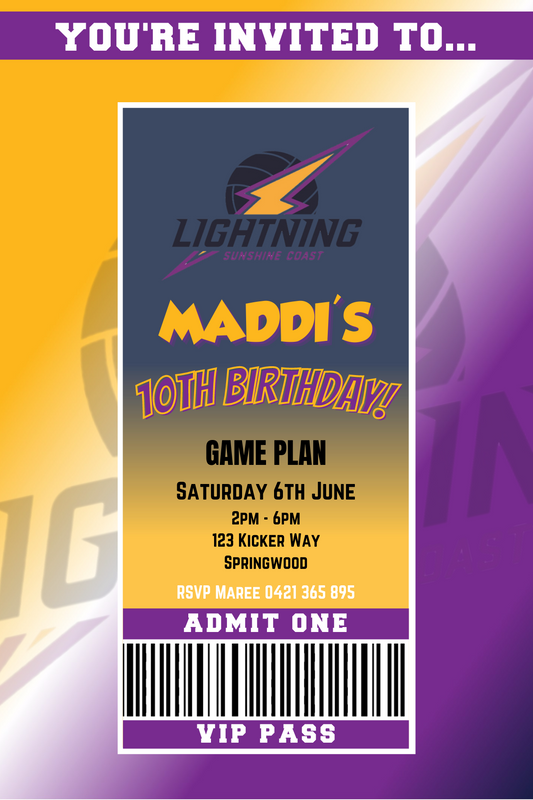 Sunshine Coast Lightning Netball VIP Pass Birthday Invitation