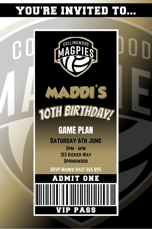 Collingwood Magpies Netball VIP Pass Birthday Invitation
